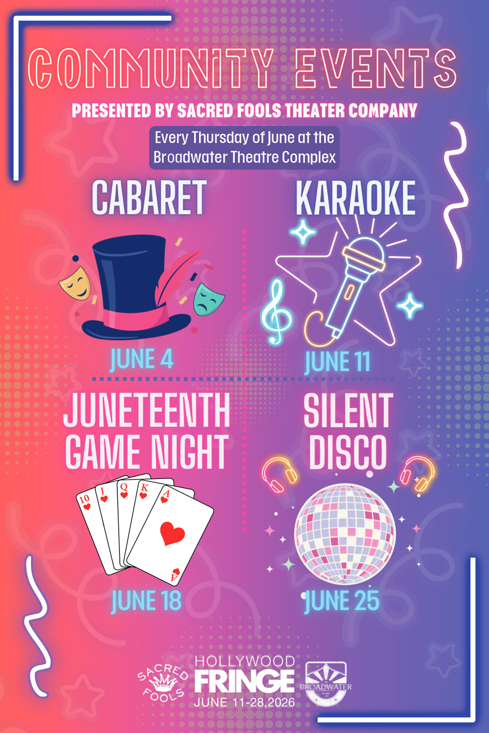 Sacred Fools is the resident theatre company and manager of the Broadwater Theater Complex! This is the 10th year that Sacred Fools has been hosting Fringe at the Broadwater and we wanted to celebrate with YOU! Join us every Thursday throughout Fringe for a special themed night of celebration and coming together.